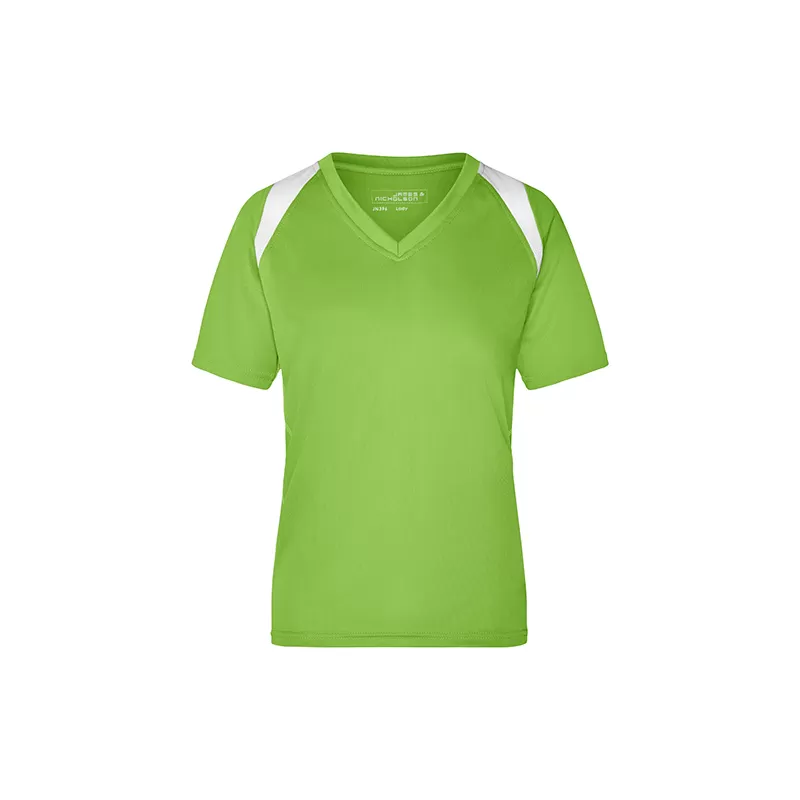 T-shirt femme Running en polyester TOPCOOL 140 g/m². Coutures plates contrastées à friction réduite pour les longues distances. Manches raglan. Transfert réfléchissant. Col V. Certifié OEKO-TEX Standard 100.