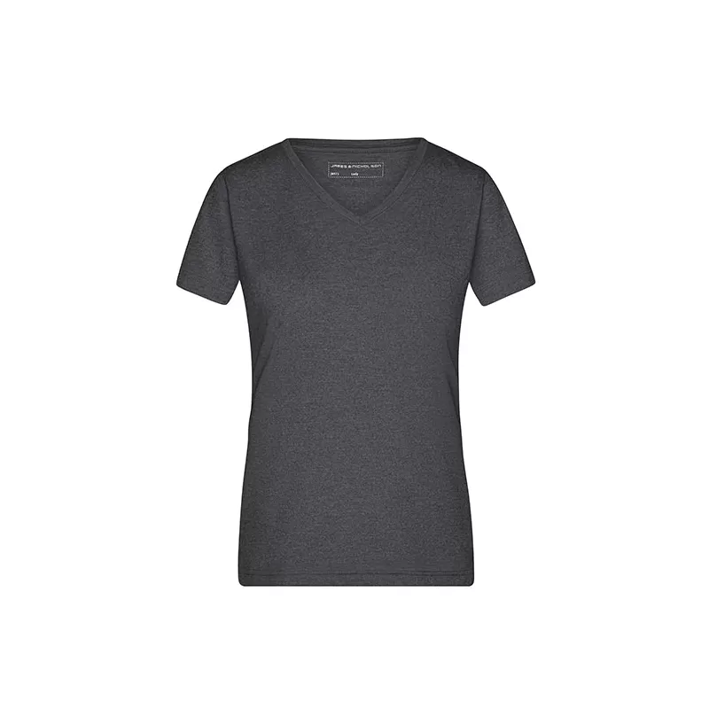 T-shirt femme Heather en mélange 65% polyester et 35% coton, jersey 170 g/m². Effet chiné tendance avec col V et élasthanne. Coupe décontractée légèrement cintrée. Look casual moderne.