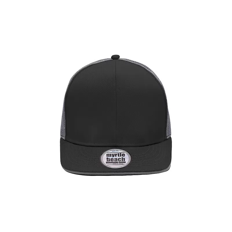 Casquette 6 panneaux Pro Cap Mesh en 100% polyester avec panneaux en maille sandwich. Visière plate avec autocollant et 6 surpiqûres. Forme profil haut. Front laminé. Bandeau rembourré. Fermeture snap plastique.