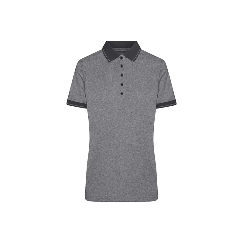Polo femme effet chiné Heather en mélange 65% polyester et 35% coton, jersey fin 170 g/m². Coupe légèrement cintrée Slim Fit avec col polo et poignets à rayures contrastées. 5 boutons. Look casual féminin.